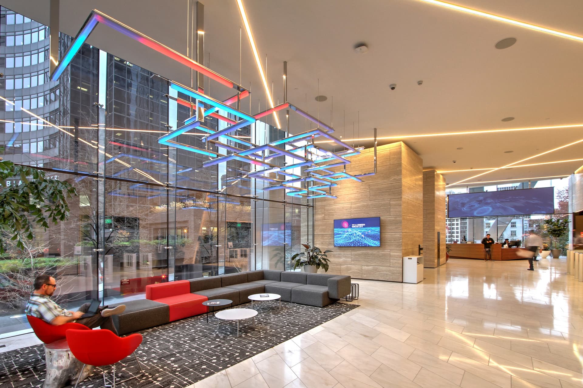 To support an ever more mobile workforce, the 30-year-old Two Union Square Tower is repositioned with public spaces and amenities, enhanced through a customized lighting design to create new social and work environments.