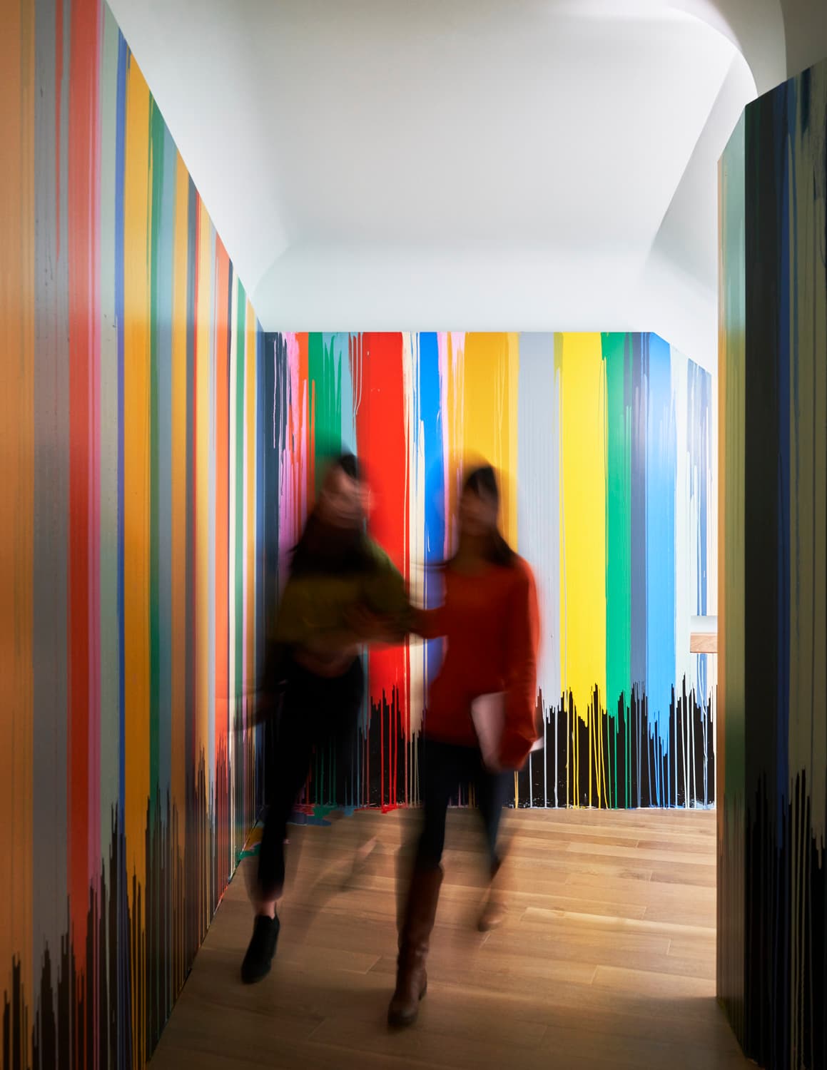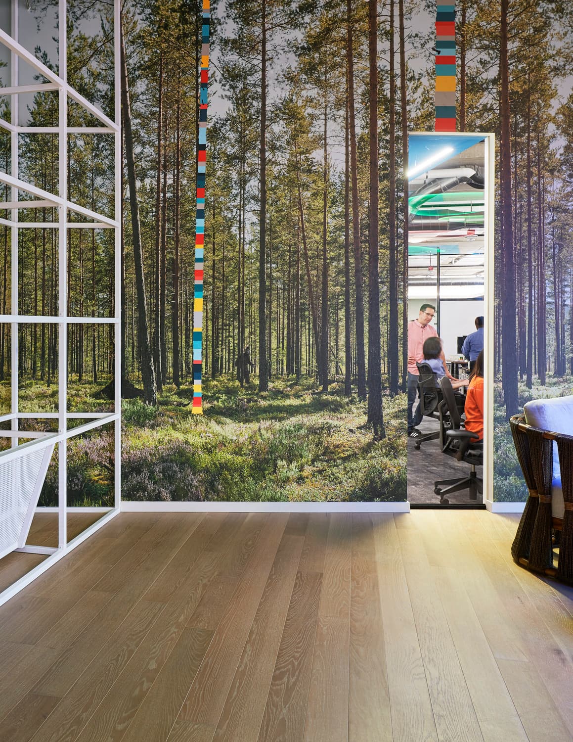 Engaging environmental graphics throughout Google's South Lake Union office encourage collaboration and creativity. This includes an immersive stairwell that transports employees from the lobby to the workplace to create an experiential portal, while representing Google's brand colors and playful attitude. In addition, the Environmental Graphics team designed pup-friendly installations throughout, including colorful dog stations modeled after real-life canines that feature water bowls, bottomless treats, toys and cleanup supplies. Furthermore, custom wall graphics included in restorative amenity zones such as a circadian-lit "treehouse" imbue spaces with calming nature-inspired elements to create a home-like feel.