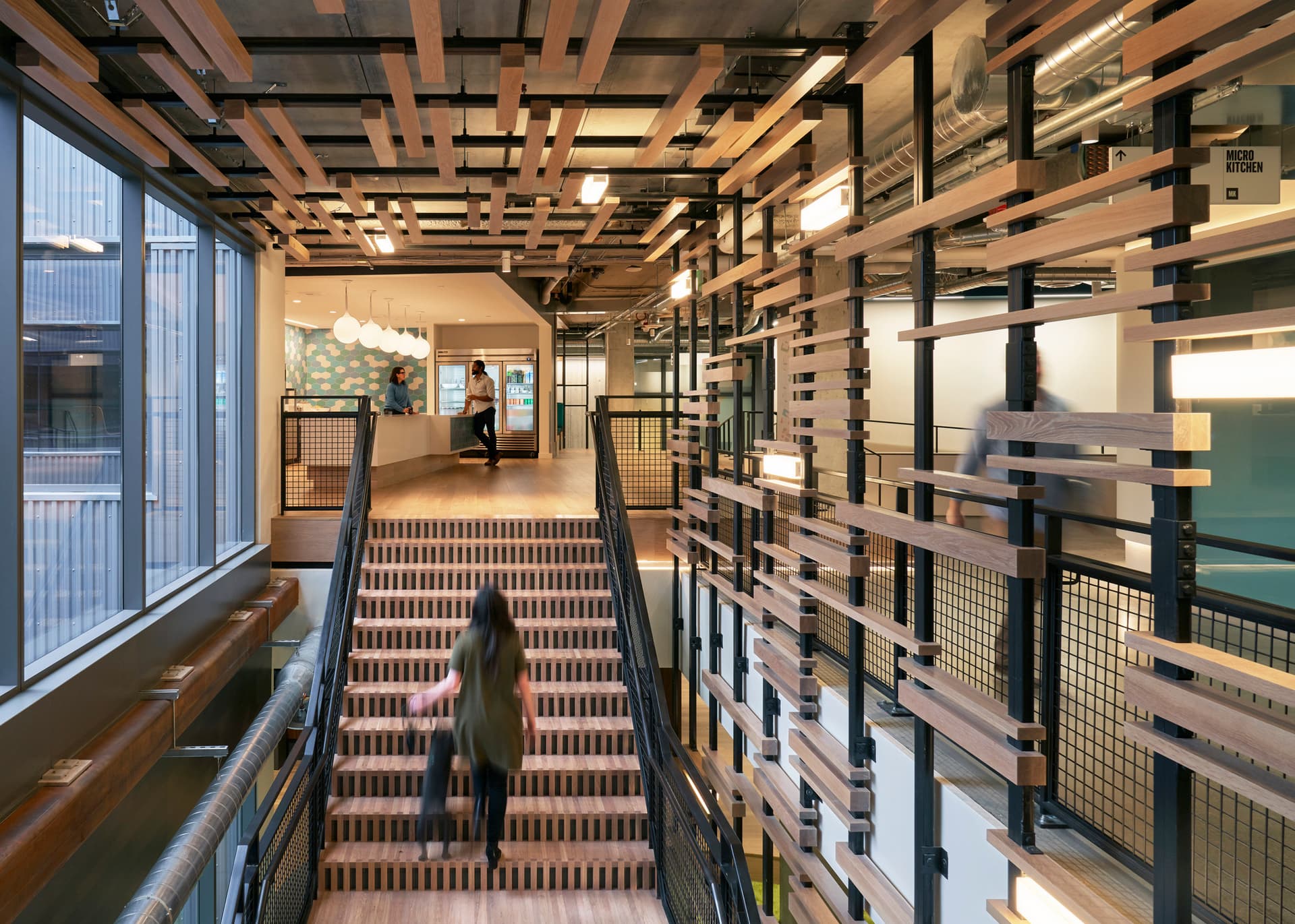 Google’s Seattle space transforms two separate buildings linked by bridges into a seamless single floor plate organized around a central lightwell. Dynamic social areas on raised platforms surround the lightwell, while diverse and uniquely programmed amenity spaces located on the north and south perimeter edges alternate direction every other floor to provide sweeping views of both Seattle's urban skyline and the scenic Lake Union shoreline. Individual workspaces line the perimeter of the building, taking advantage of the natural light and proximity to amenity spaces. A continually shifting connected stair weaves through the center of the space, offering opportunities for casual connections and Googler interactions.