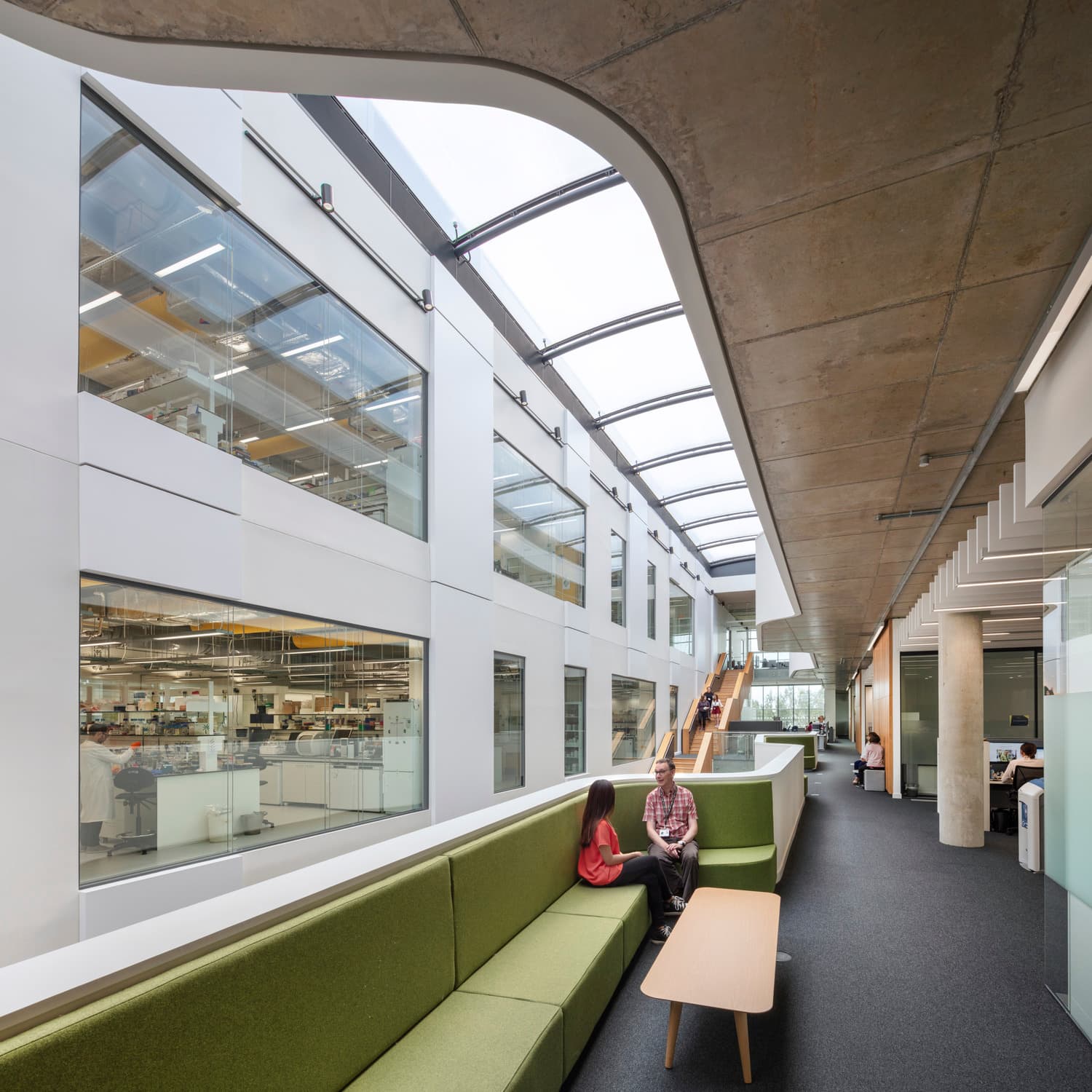 The feature stair fosters collaboration between researchers and offices, and atrium-facing balconies providing space for informal discussion and meeting. Large, glazed window openings provide excellent visual connectivity from office desk to laboratory bench, and between floors across the atrium lightwell